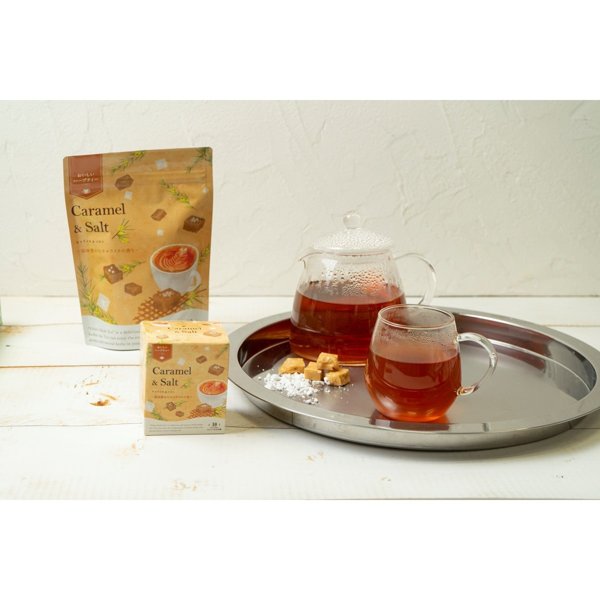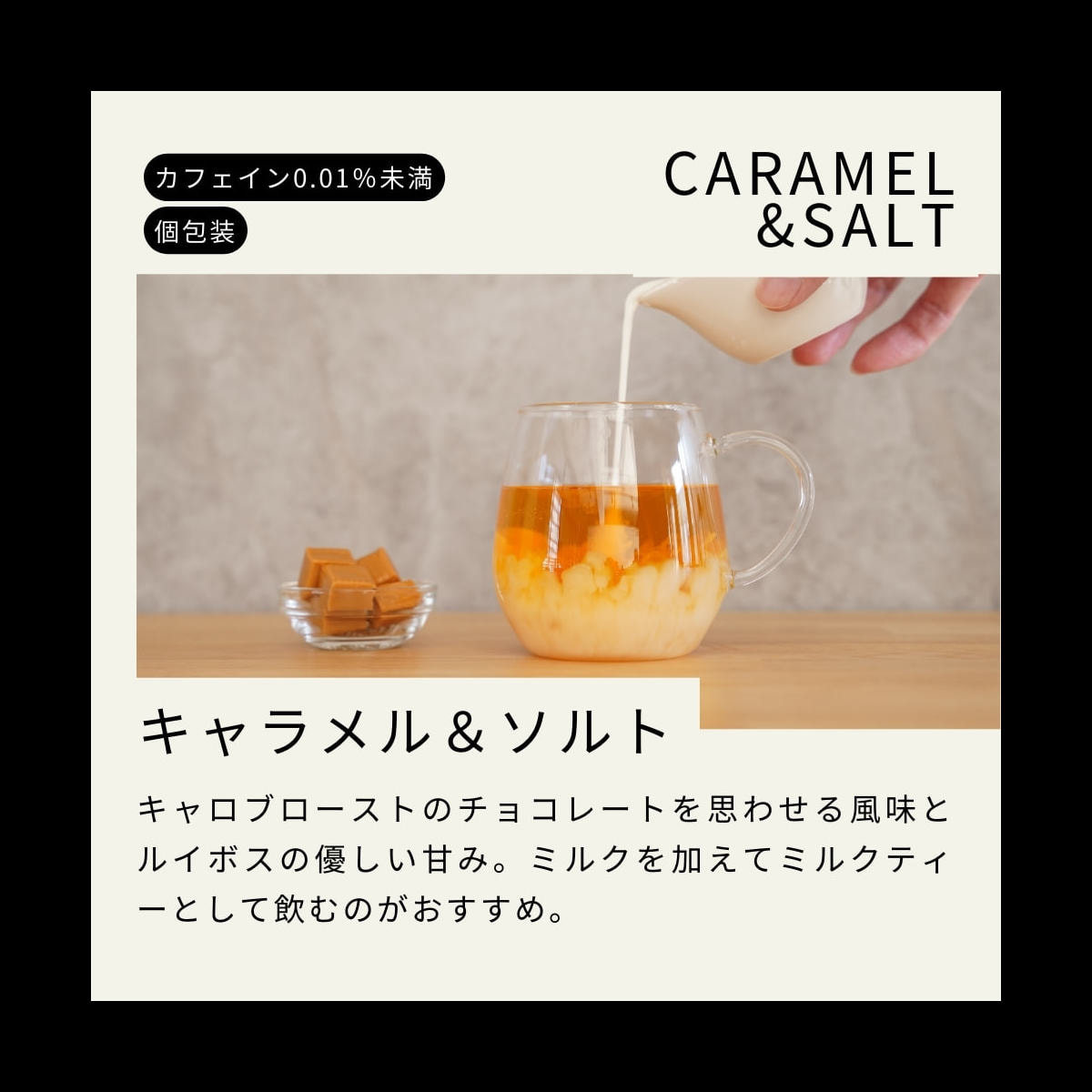 ルイボス、アップル、キャロブロースト、チコリールートロースト、キャラメルパウダー、カカオ豆ロースト、ステビア、塩、クエン酸、香料